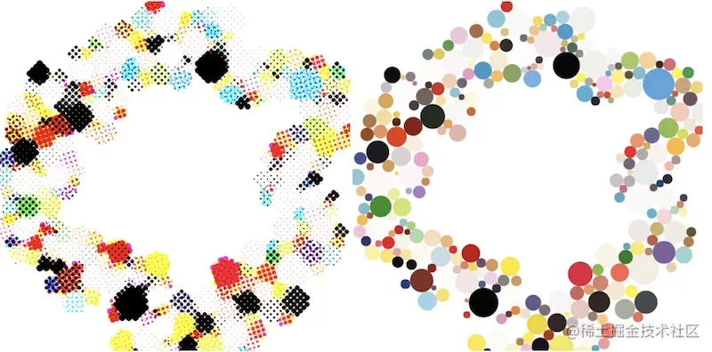 尽管如此,我还是先投入 Veltman 的令人惊叹的代码,在这里他已经将 CMYK 点效果巧妙地编码成 SVG 模式(顺便提下,我开始在Pinterest / DataViz | D3.js Demos - Nadieh Bremer上收集自己喜欢的 d3.js 内容),所以我有个视觉化的“书签”方便检索。重写代码,为每种颜色创建一种单独的图案,然后我得到一个充满了基于 CMYK 颜色圆圈的圆环。但是仔细检查后,我发现了一些我不喜欢的东西,尽管里面的圆圈看起来确实像我想要的,但它们仍然是 SVG 元素。它们已经完美地被剪裁成一个圆圈,就像被剪裁的图案。但是我希望我的 CMYK 点的边缘更平滑;以及我还想尝试下使圆圈部分重叠,并使颜色进一步混合,这些都是当前的实现无法达到的。