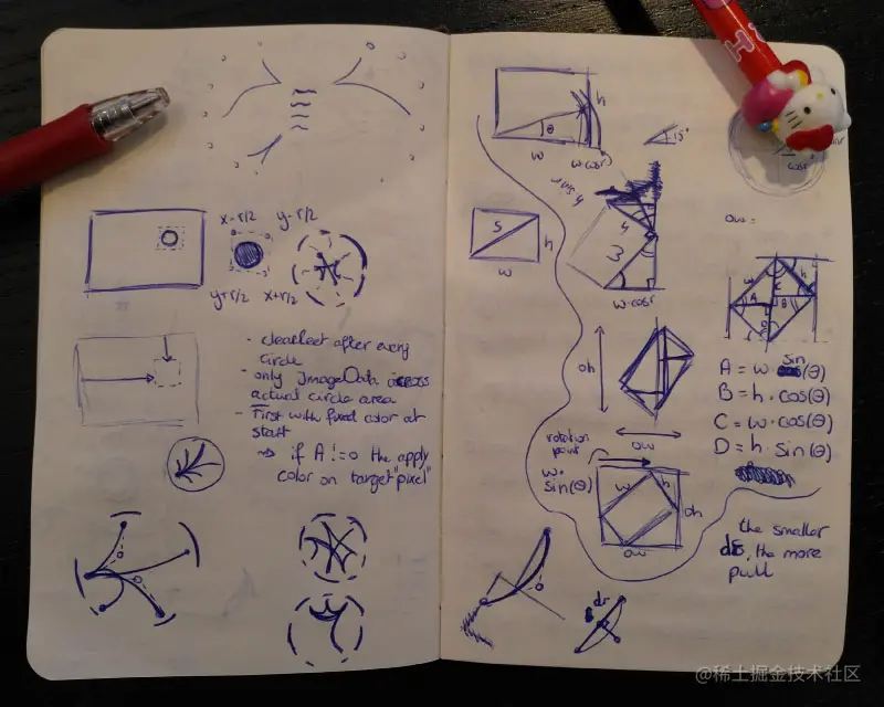 我一直对 CMYK 点打印过程/CMYK dot printing process 着迷;当你近距离观察时可以看到单独的点,但远点观察,可以看到更大的画面(我想我并不是唯一一个会用鼻子从字面上触摸旧杂志、或旧电视(看RGB条纹)的人,对吧?)。重新创建这种 CMYK点技术,以可视化展示(印刷)漫画,似乎是一种合适的方式,当然也更具挑战。确实很有挑战!我不会在这里进行详细介绍(你可以在代码部分了解更多内容),但是在下图的右侧,您可以看到我为了解如何重新创建 CMYK 效果而画的一些草稿(需要进行旋转操作...)。