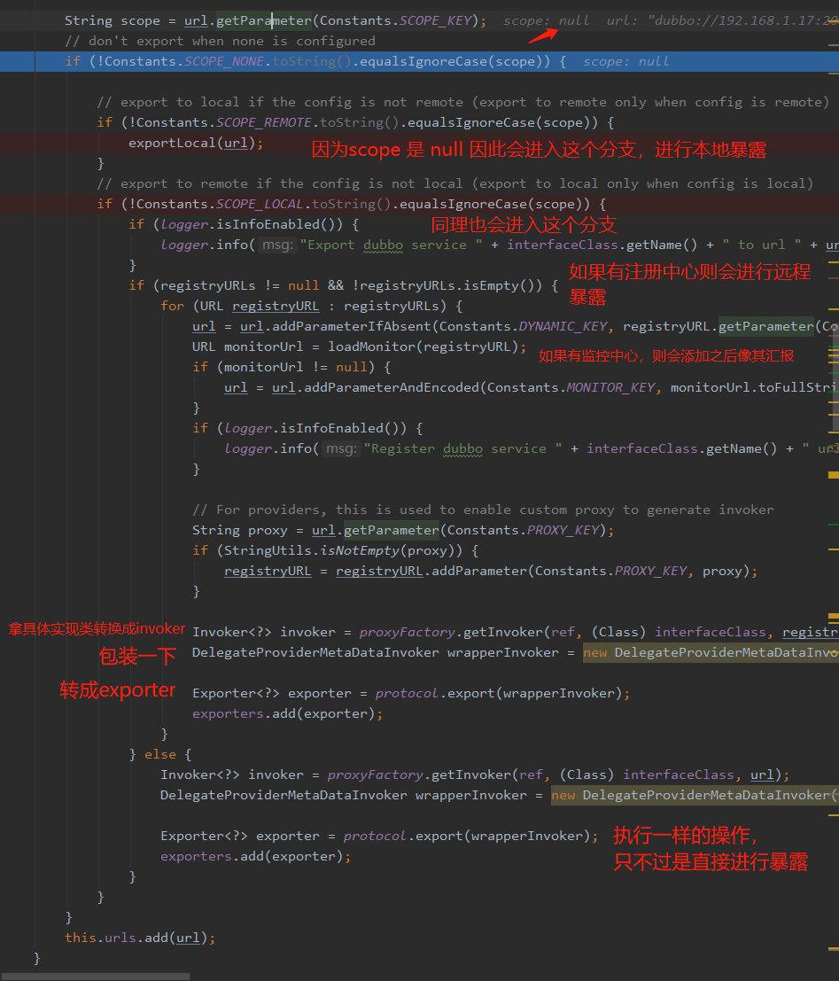 然后就是要根据 URL 来进行服务暴露了,我们再来看下代码,这段代码我就直接截图了,因为需要断点的解释。
