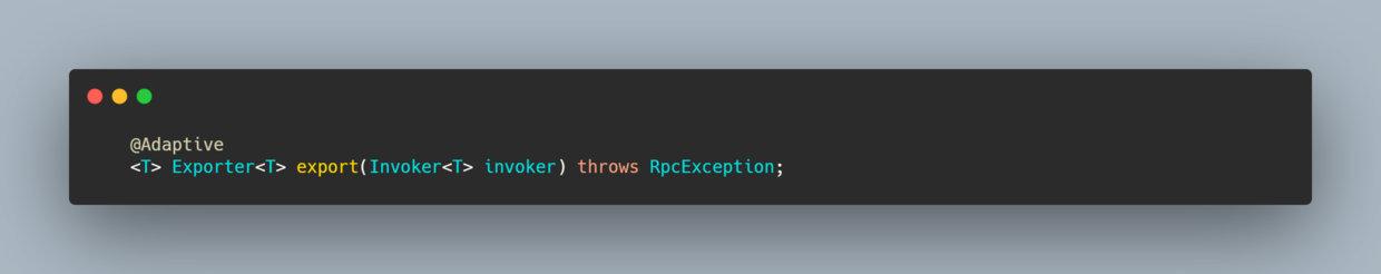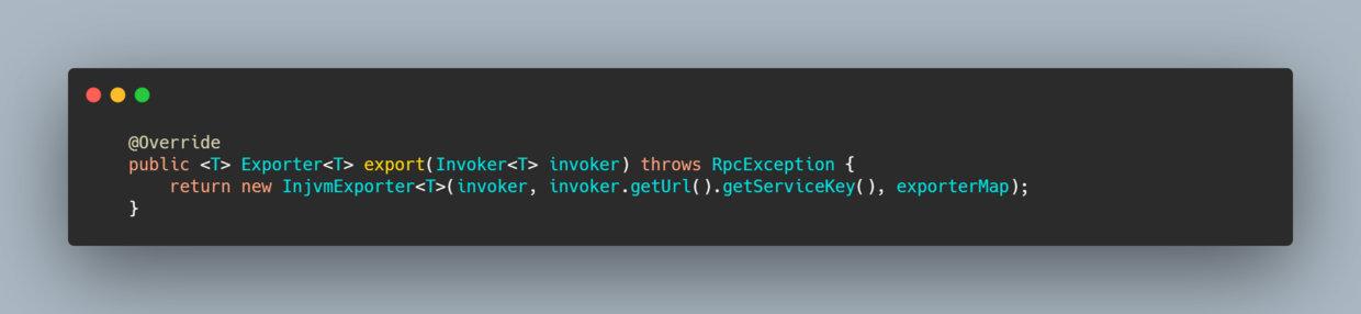 Protocol 的 export 方法是标注了 @ Adaptive 注解的,因此会生成代理类,然后代理类会根据 Invoker 里面的 URL 参数得知具体的协议,然后通过 Dubbo SPI 机制选择对应的实现类进行 export,而这个方法就会调用 InjvmProtocol#export 方法。