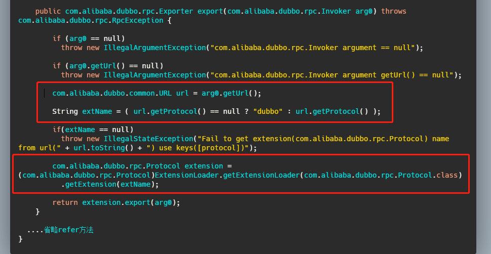 因为很长,我就不截全了,可以看到走 registry 协议,然后参数里又有 export=dubbo://,这个走 dubbo 协议,所以我们可以得知会先通过 registry 协议找到 RegistryProtocol 进行 export,并且在此方法里面还会根据 export 字段得到值然后执行 DubboProtocol 的 export 方法。
