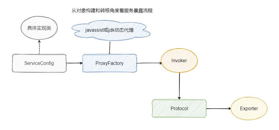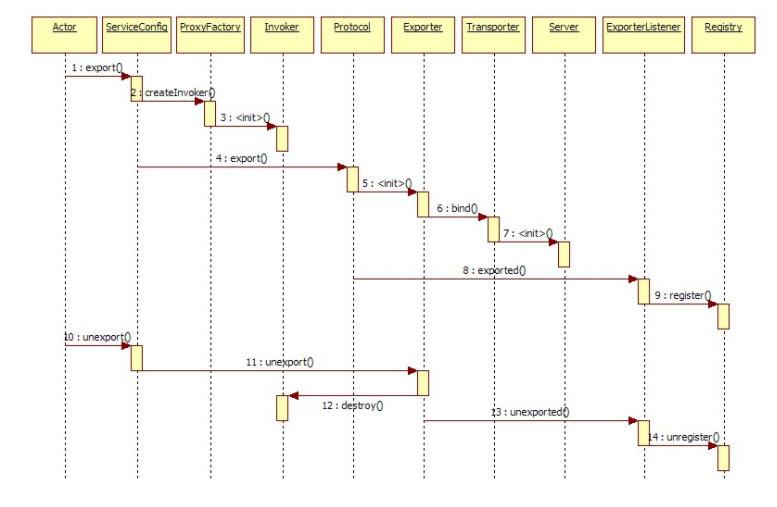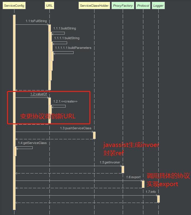 通过 javassist 动态封装 ref (你写的服务实现类),统一暴露出 Invoker 使得调用方便,屏蔽底层实现细节,然后封装成 exporter 存储起来,等待消费者的调用,并且会将 URL 注册到注册中心,使得消费者可以获取服务提供者的信息。