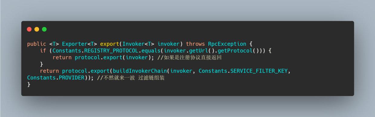而在 ProtocolFilterWrapper 的 export 里面就会把 invoker 组装上各种 Filter。