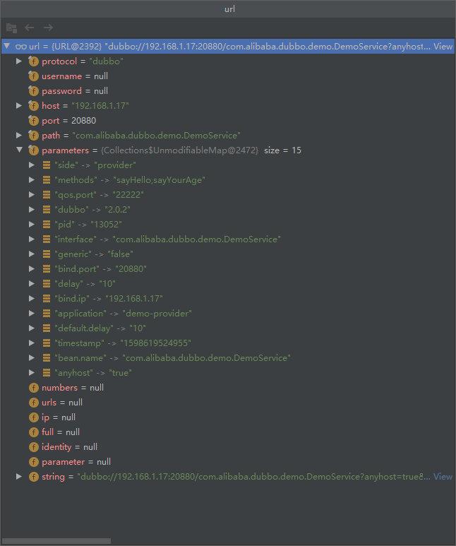 此时构建出来的 URL 长这样,可以看到走得是 dubbo 协议。