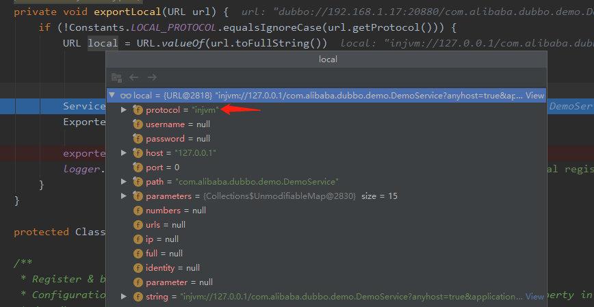 我们再来看一下 exportLocal 方法,这个方法是本地暴露,走的是 injvm 协议,可以看到它搞了个新的 URL 修改了协议。