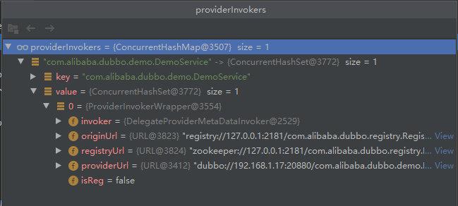 可以看到这一步主要是将上面的 export=dubbo://... 先转换成 exporter ,然后获取注册中心的相关配置,如果需要注册则向注册中心注册,并且在 ProviderConsumerRegTable 这个表格中记录服务提供者,其实就是往一个 ConcurrentHashMap 中将塞入 invoker,key 就是服务接口全限定名,value 是一个 set,set 里面会存包装过的 invoker 。
