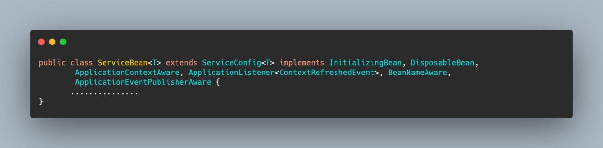 接下来我们进入源码分析阶段,从上面配置解析的截图标红了的地方可以看到 service 标签其实就是对应 ServiceBean,我们看下它的定义。
