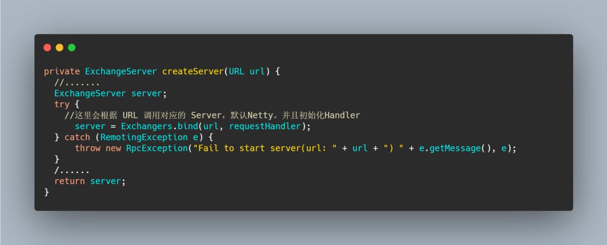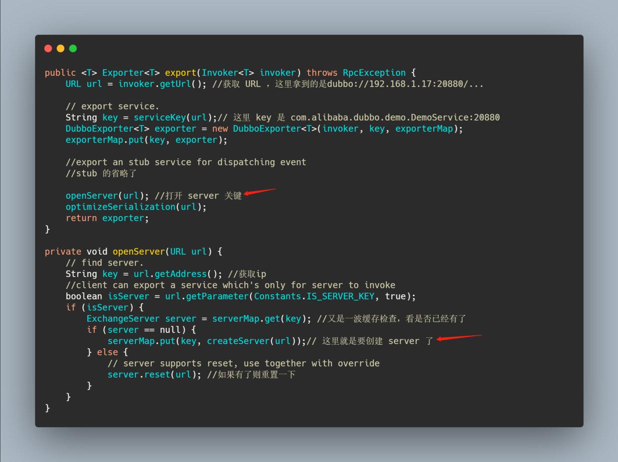 再下面我就不跟了,我总结一下 Dubbo 协议的 export 主要就是根据 URL 构建出 key(例如有分组、接口名端口等等),然后 key 和 invoker 关联,关联之后存储到 DubboProtocol 的 exporterMap 中,然后如果是服务初次暴露则会创建监听服务器,默认是 NettyServer,并且会初始化各种 Handler 比如心跳啊、编解码等等。