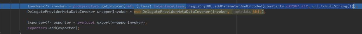 也和本地暴露一样,需要封装成 Invoker ,不过这里相对而言比较复杂一些,我们先来看下 registryURL.addParameterAndEncoded(Constants.EXPORT_KEY, url.toFullString()) 将 URL 拼接成什么样子。
