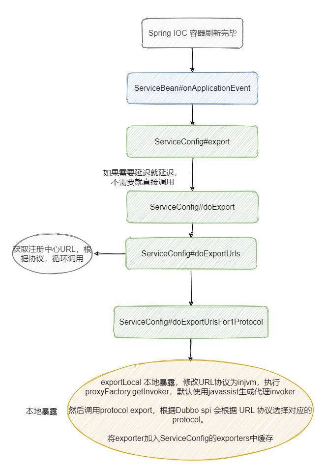 总的而言服务暴露的过程起始于 Spring IOC 容器刷新完成之时,具体的流程就是根据配置得到 URL,再利用 Dubbo SPI 机制根据 URL 的参数选择对应的实现类,实现扩展。