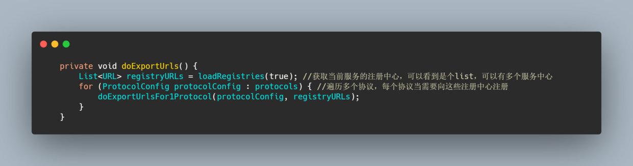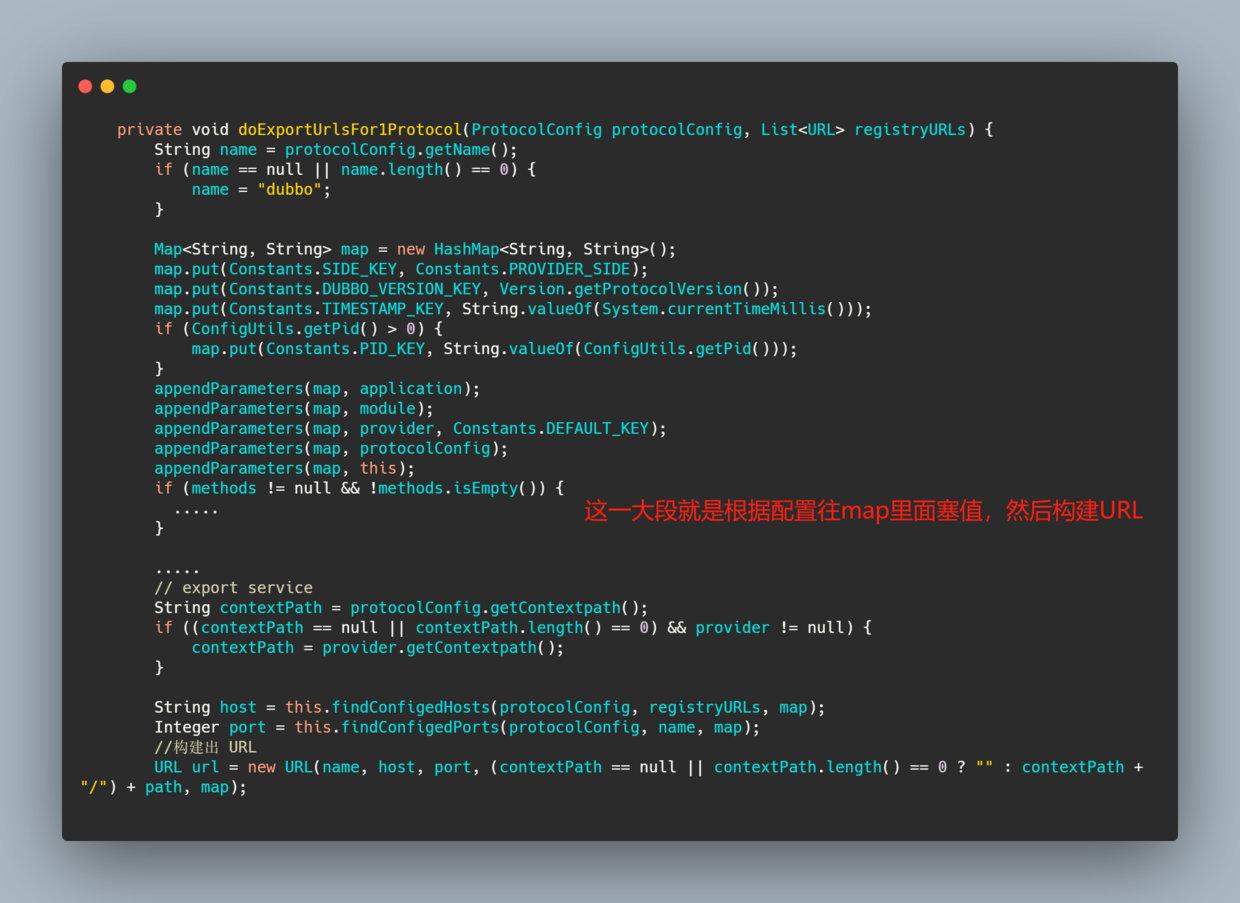 我们接下来关注的重点在 doExportUrlsFor1Protocol 方法中,这个方法挺长的,我会截取大致的部分来展示核心的步骤。