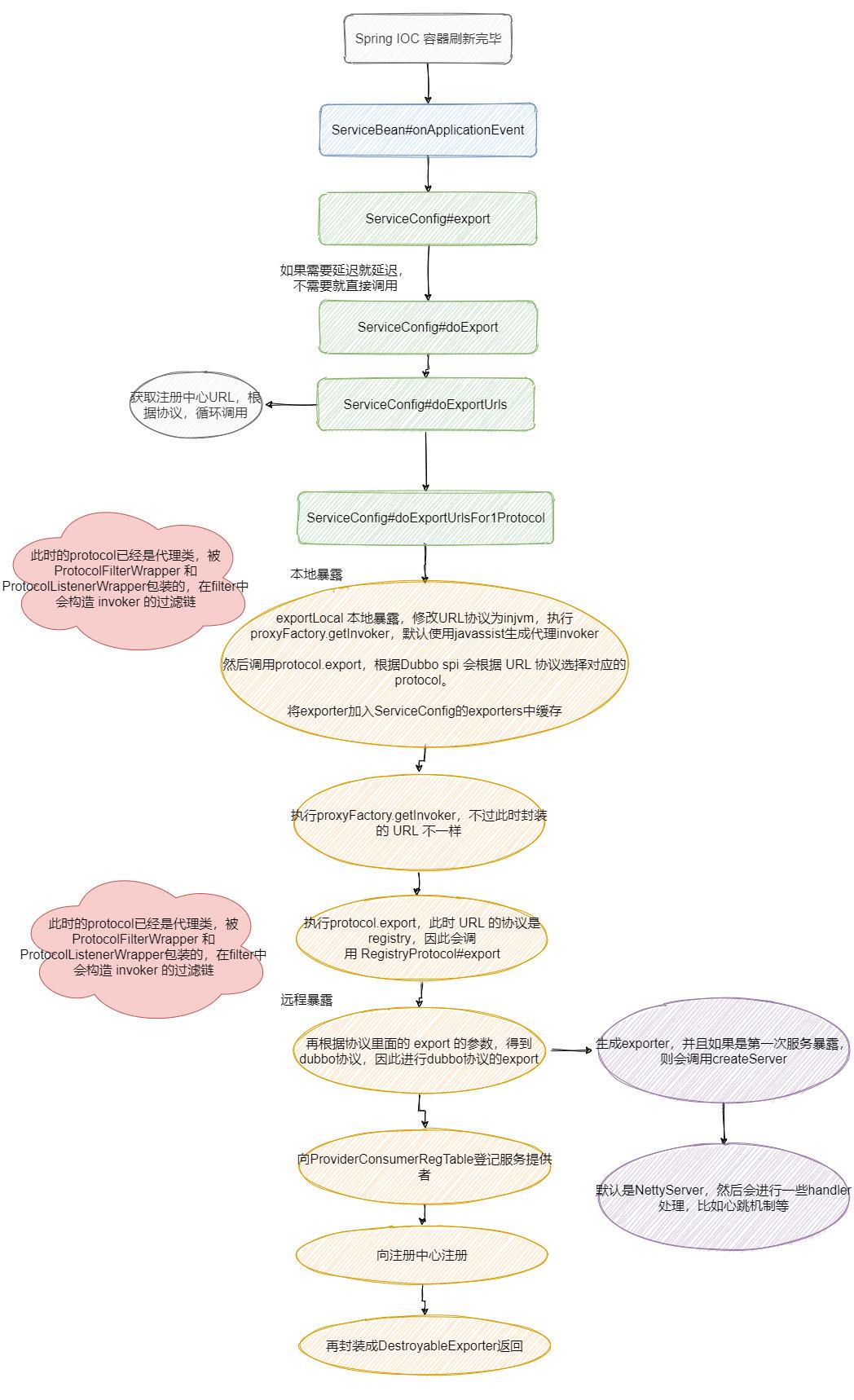 至此服务流程暴露差不多完结了,可以看到还是有点内容在里面的,并且还需要掌握 Dubbo SPI,不然有些点例如自适应什么的还是很难理解的。最后我再来一张完整的流程图带大家再过一遍,具体还是有很多细节,不过不是主干我就不做分析了,不然文章就有点散。