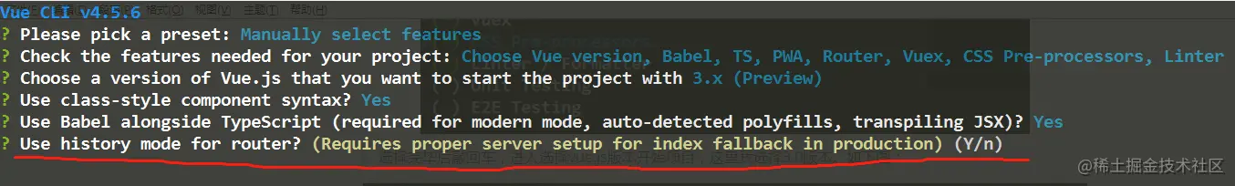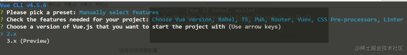 选择完毕后敲回车,进入选择vue.js版本开始项目,这里我选择3.0版本。如下图:
