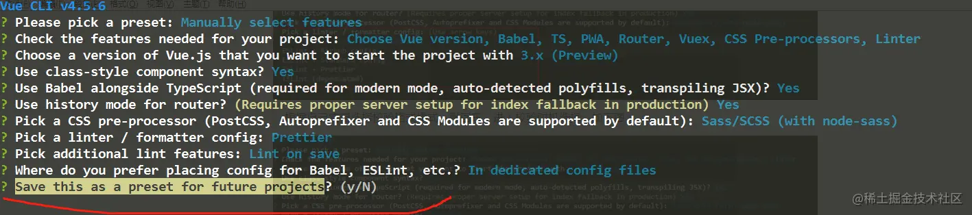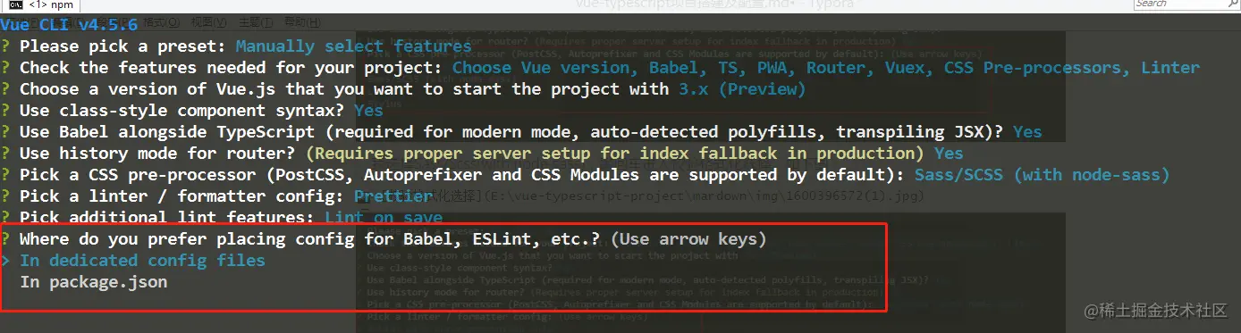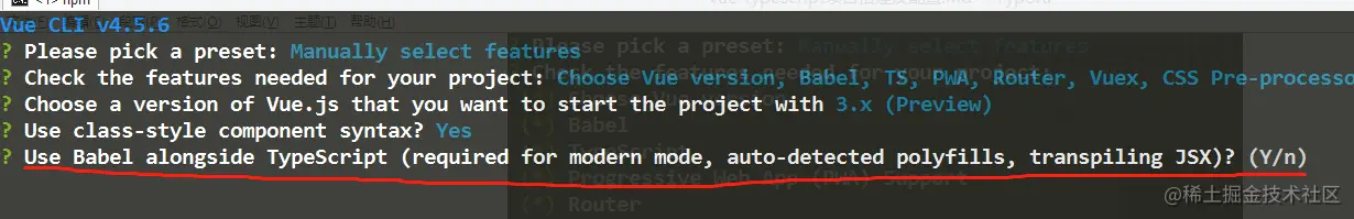 选择是,敲回车,出现“ 在TypeScript中使用Babel(现代模式需要,自动检测填充,编译JSX)? ”。如下图: