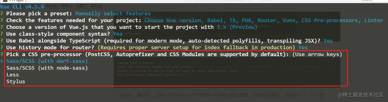 选择是,敲回车,进入css预编译选择。如下图: