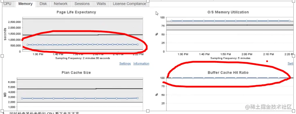 2 监控resource:监控工具检查了当前内存资源使用情况,从内存的置换率以及内存中页中生存周期参数,自上次重启后指标相对平稳