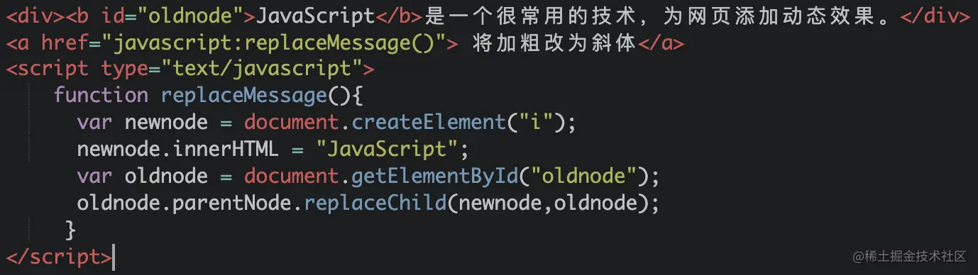 通过repalceChild()方法替换子节点,返回被替换对象的引用。