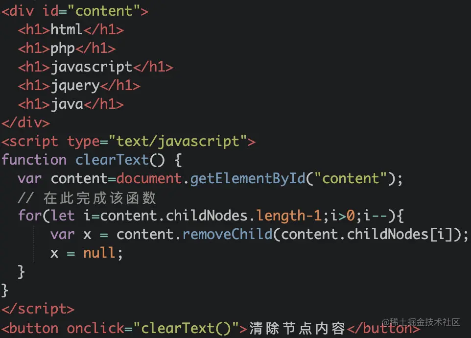注意:这里应该使用反向遍历,因为removeChild()方法是动态删除的,使用反向遍历能确保每次删除的都是最后一个,而使用正向遍历则因为每次删除,元素对应的下标都在变化,所以不能成功删除。