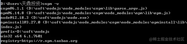- 验证安装 cnpm -v 如下显示则可代表安装成功