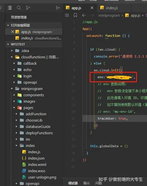 按照引导一直点到开通,给你的应用起个名字,这些做完后右键点击cloudfunctions目录,选择你创建的那个环境,然后点开app.js文件把你的应用ID配置进去。