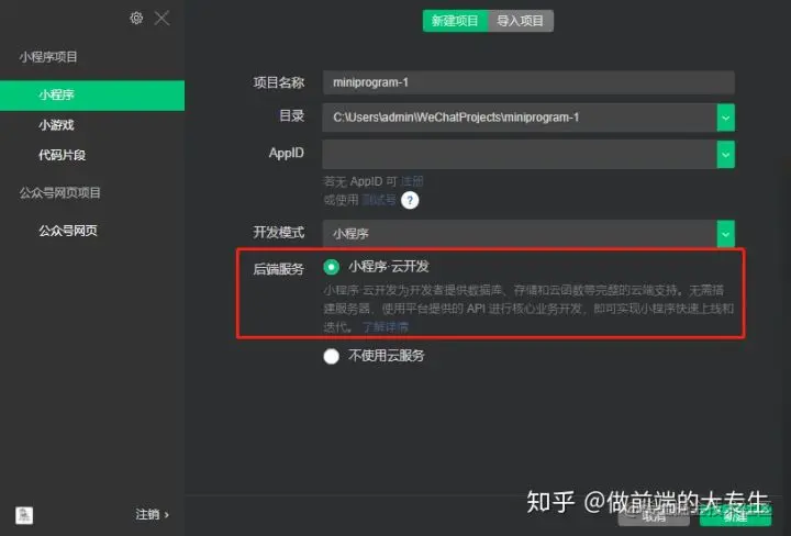 在微信小程序中我们能非常简单的建立起一个serverless应用,只要在新建项目时候选择小程序云开发即可,如下图