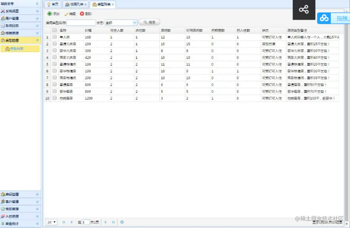 实体:房型id、房型名称、房型价格、房型状态、床位数、可住人数,房型备注。