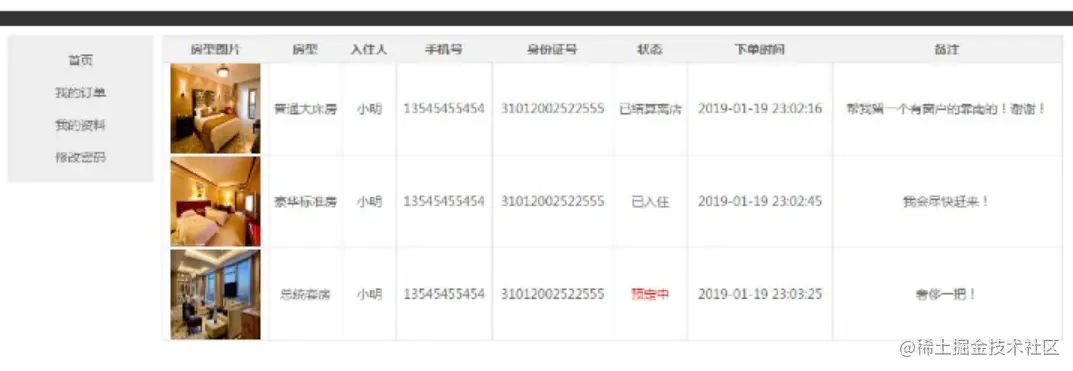 实体:订单id、用户id、所属房型、入住人姓名、入住人身份证、手机号、预定日期,备注。