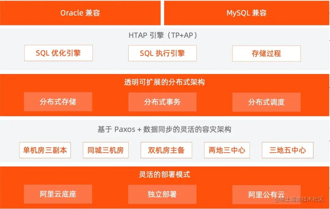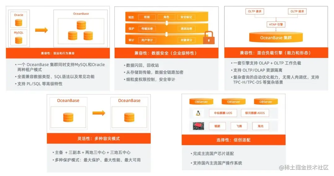 作为一体化设计的企业级数据库,OceanBase有一套产品兼容主流的数据库,保证平滑迁移,并拥有一套HTAP引擎同时支持TP和AP业务,统一的SQL界面,便于共享数据。同时,OceanBase采用第三代数据库引擎,透明可扩展,避免分库分表,原生支持分布式事务,全局强一致。基于Paxos+数据同步的灵活容灾架构,可以支持最高级别容灾模式,也支持经典模式。
