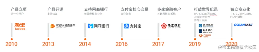 在过去的十年里,OceanBase支撑了支付宝、网商银行等重要业务,经历了阿里超大规模业务场景、支付宝金融级场景以及双11等战役的历练,充分展现了其极致的性能,而后面向更广阔的市场需求,为更多领域更多的客户提供数据服务,现已成长为目前全世界唯一经过大规模金融场景长时间考验的分布式关系数据库。