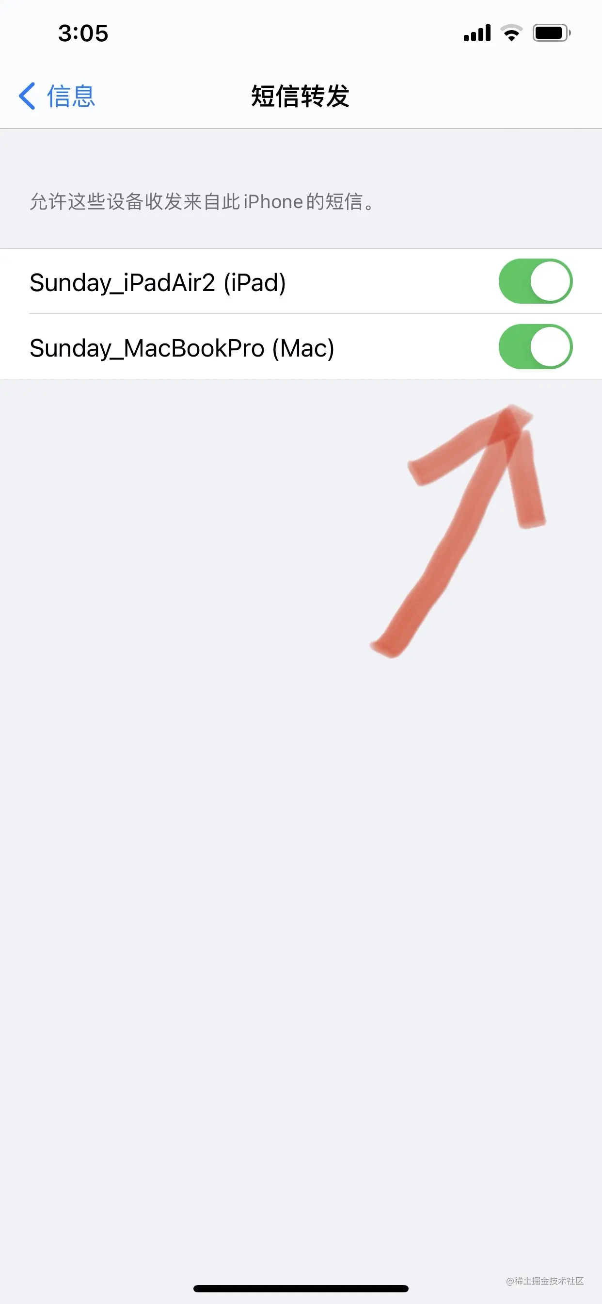 温馨提示:需要iPad开启转发短信的同学,直接在iPad上“信息”App,登录Apple ID,然后在iPhone上勾选iPad即可(如上图)