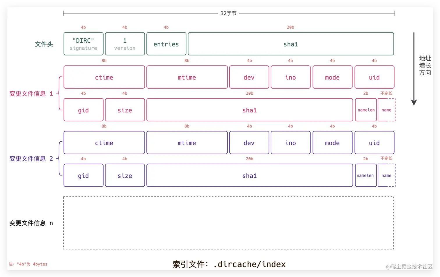 .dircache/index 索引文件使用二进制存储相关内容,该文件由 文件头 + 变更文件信息 组成: