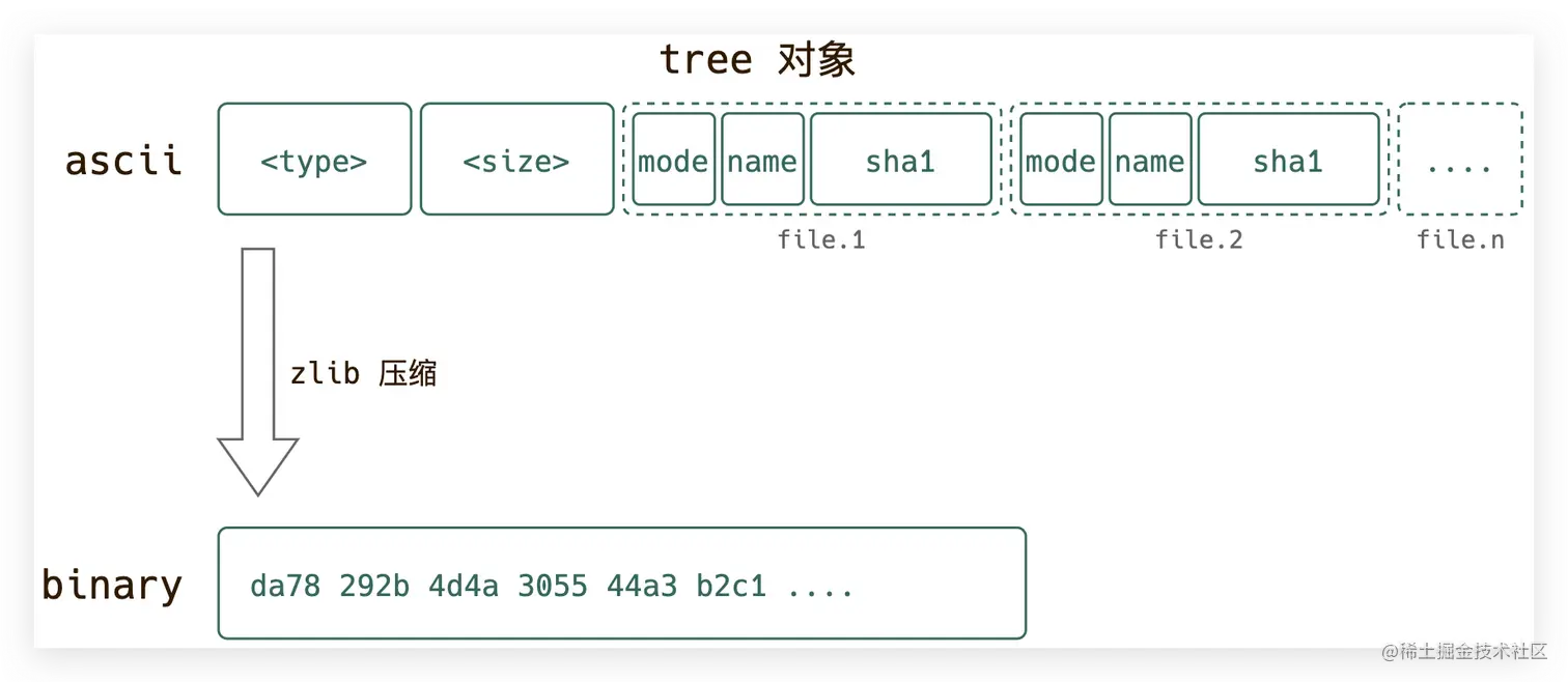 tree 对象由 <type> + <size> + 文件模式 + 文件名称 + 文件sha1值 拼装并压缩: