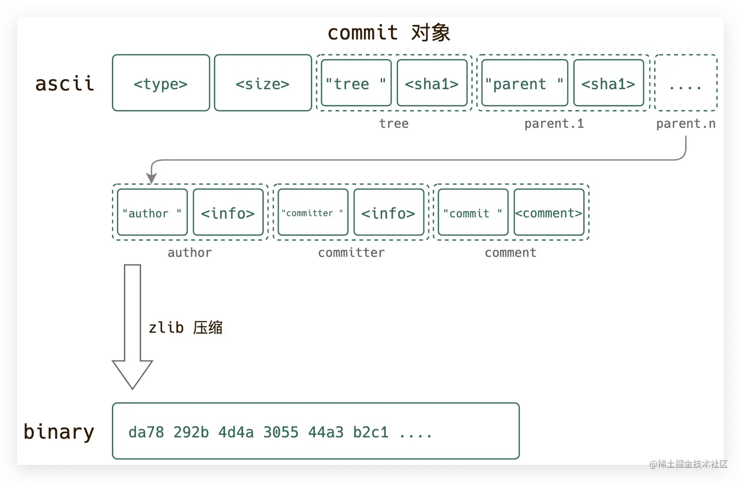 commit 对象由<type> + <size> + <tree, sha1> + <parent, sha1>* + <author-info> + <committer-info> + <comment> 拼装并压缩: