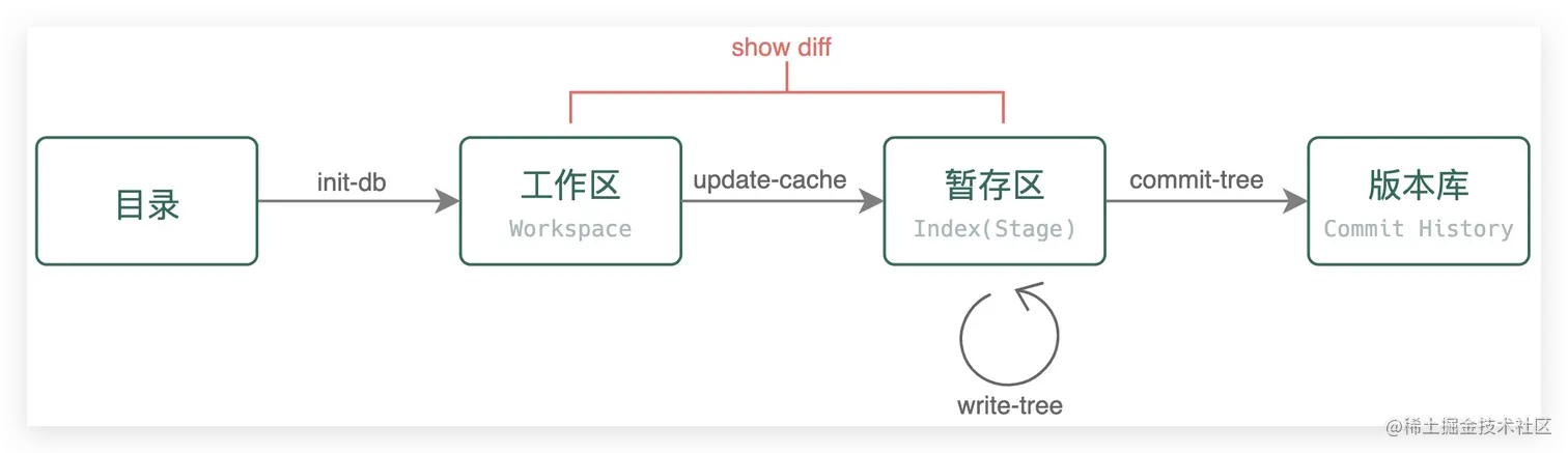 每个可执行文件的具体分工是:init-db 用来创建一个初始化仓库,update-cache 会将 工作区 的变更写到 索引文件 (index)中,write-tree 会将之前的所有变更整理成 tree 对象,commit-tree 会将 指定的 tree 对象写到本地版本库中。另外,show-diff 用来查看 工作区 和 暂存区 中的文件差异,read-tree 用来读取 tree对象 的信息。