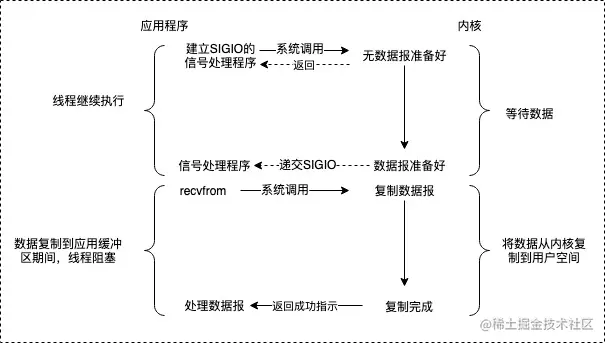 当数据准备好时,进程会收到一个 SIGIO 信号,可以在信号处理函数中调用 I/O 操作函数处理数据。
