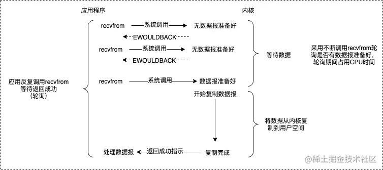而是返回一个错误,应用程序基于 I/O 操作函数将不断的轮询数据是否已经准备好,如果没有准备好,继续轮询,直到数据准备好为止。