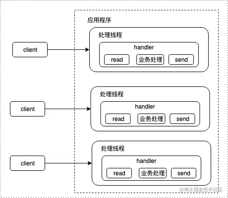 每个连接都需要独立的线程完成数据输入,业务处理,数据返回的完整操作。