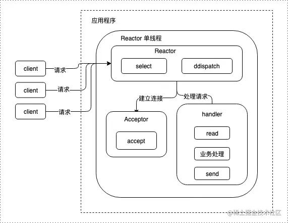 Reactor:Reactor 在一个单独的线程中运行,负责监听和分发事件,分发给适当的处理线程来对 IO 事件做出处理。
