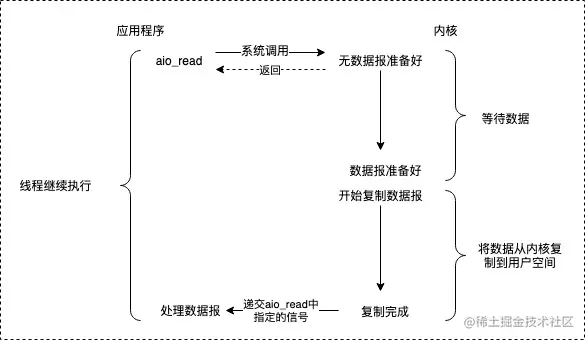 由 POSIX 规范定义,应用程序告知内核启动某个操作,并让内核在整个操作(包括将数据从内核拷贝到应用程序的缓冲区)完成后通知应用程序。