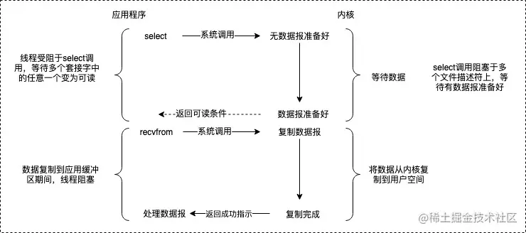 在 I/O 复用模型中,会用到 Select 或 Poll 函数或 Epoll 函数(Linux 2.6 以后的内核开始支持),这两个函数也会使进程阻塞,但是和阻塞 I/O 有所不同。