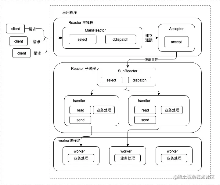 这种模型在许多项目中广泛使用,包括 Nginx 主从 Reactor 多进程模型,Memcached 主从多线程,Netty 主从多线程模型的支持。