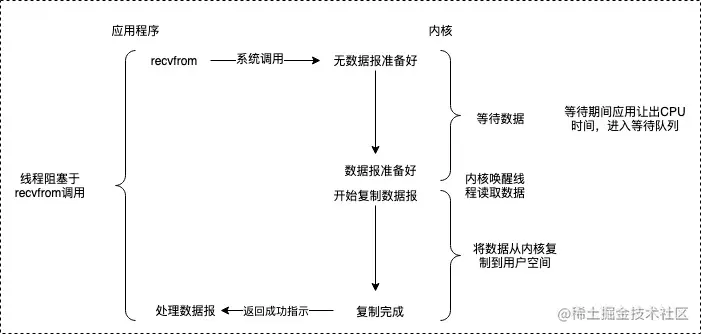 在阻塞式 I/O 模型中,应用程序在从调用 recvfrom 开始到它返回有数据报准备好这段时间是阻塞的,recvfrom 返回成功后,应用进程开始处理数据报。