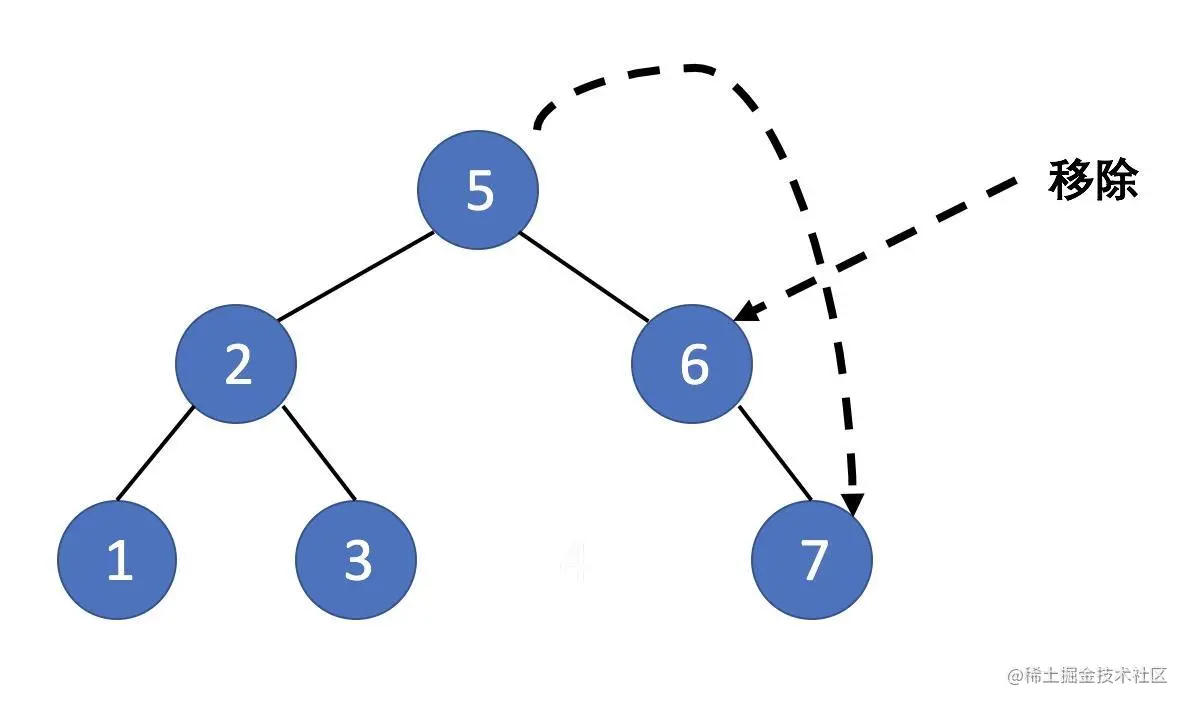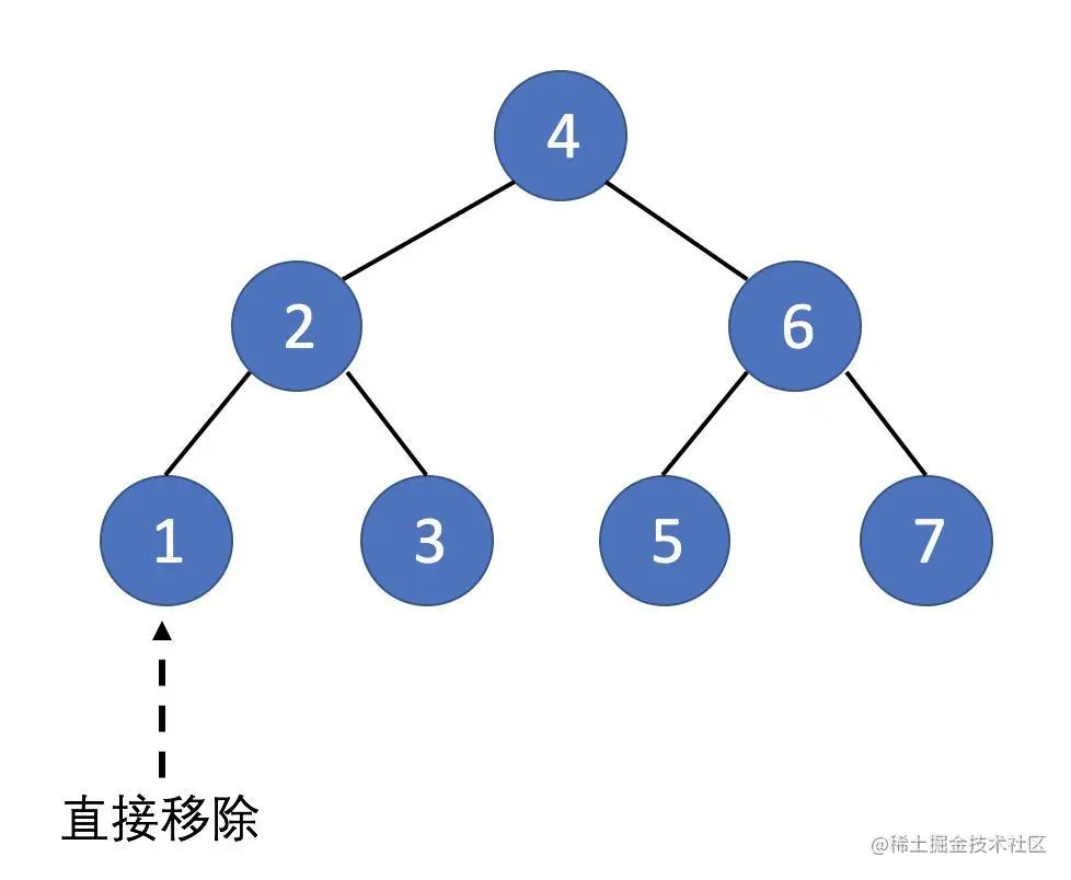 O(n)。 - 二叉搜索树:图中二叉树的4没有子节点,直接把它移除即可。如果他有子节点,会稍微复杂一些,等会会讲到这个,但是时间复杂度还是