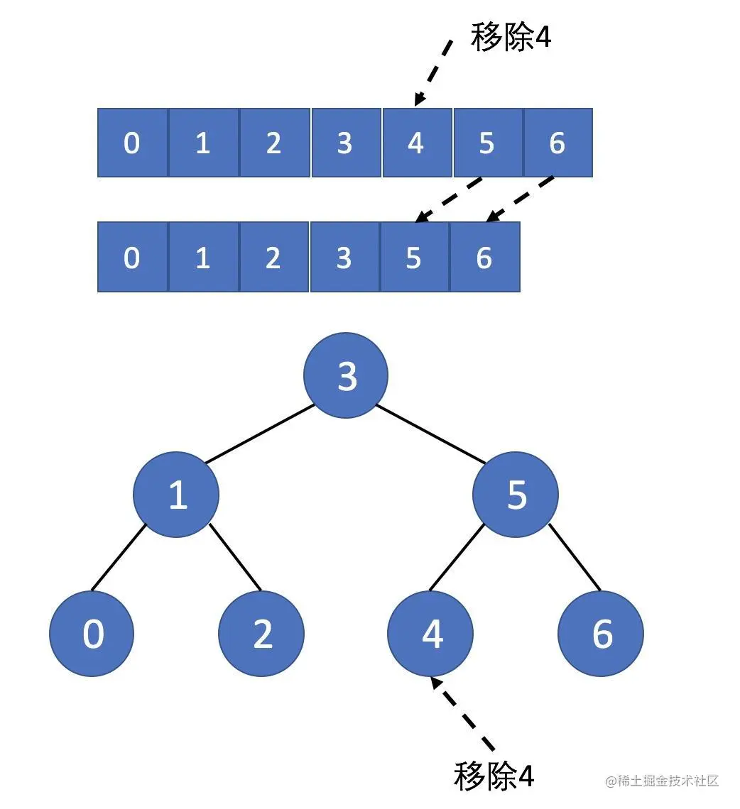 假设我们要在这两个数据结构中移除 4: