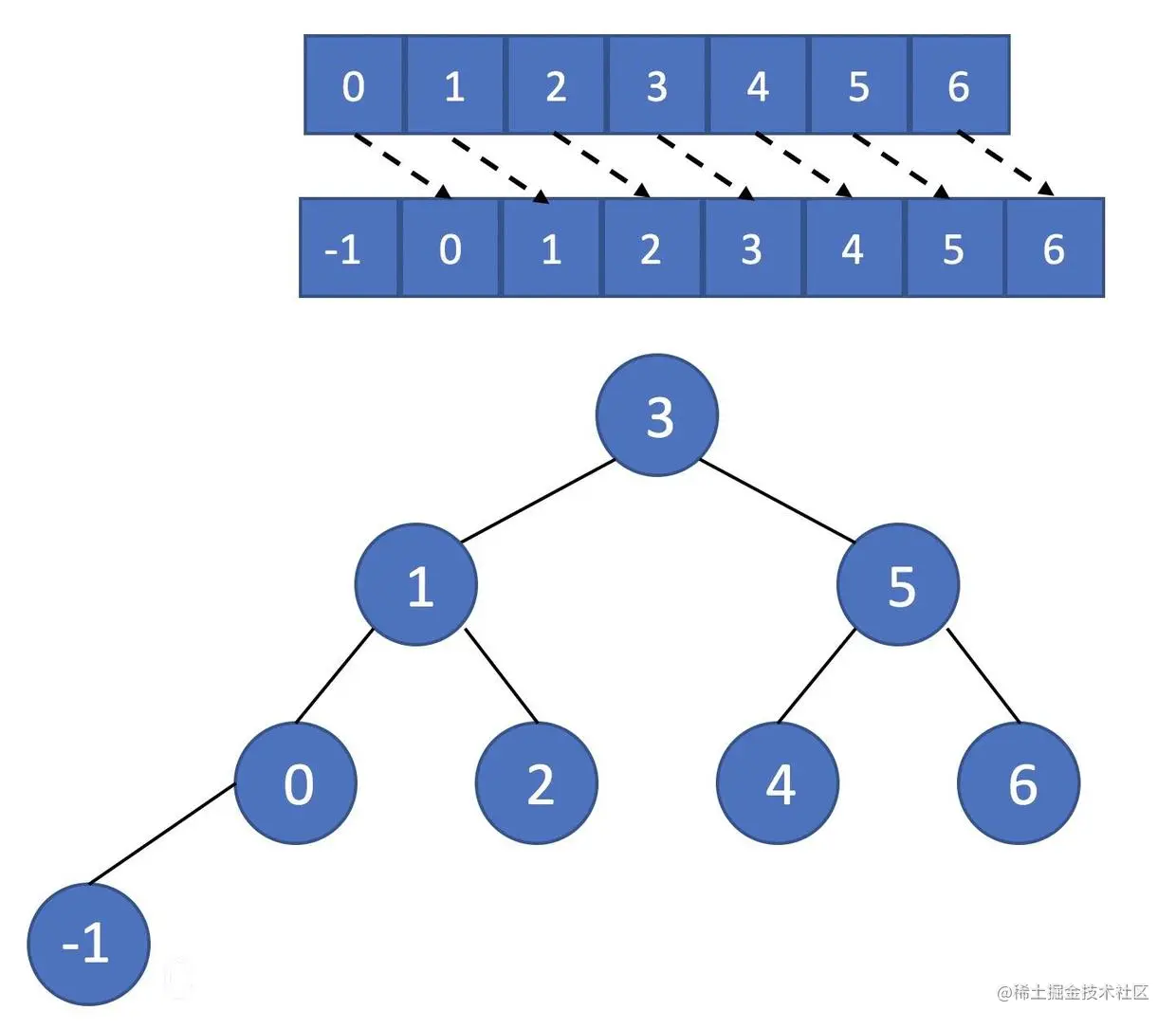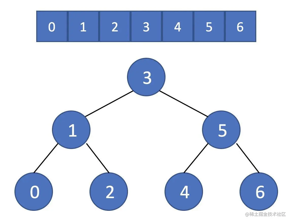我们先来看看二叉搜索树和数组在查找、插入和删除操作的效率对比。假设我们有下列数组和二叉搜索树: