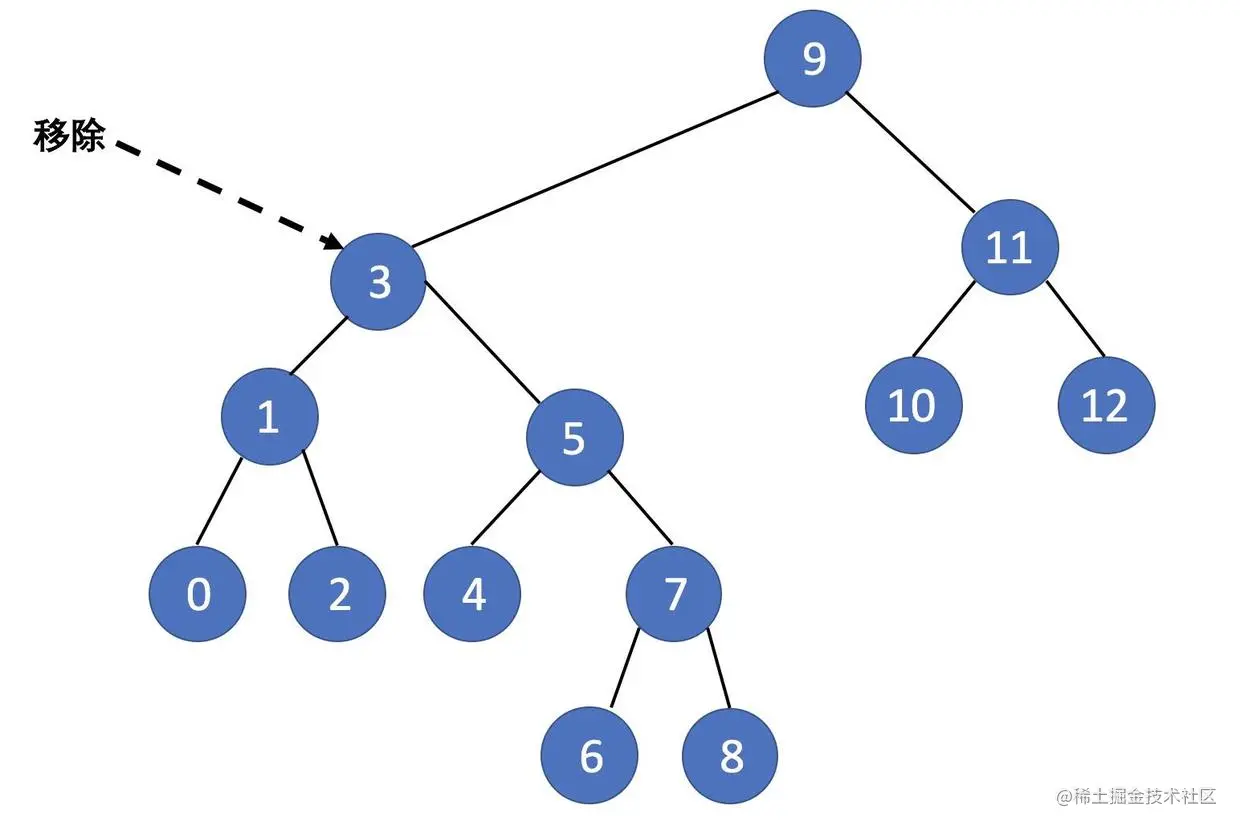先插入0到12,接着把3移除,最后用中序遍历(左根右),3被移除,并且所有的节点还是按照对小到大排列,说明我们写的移除方法没错。