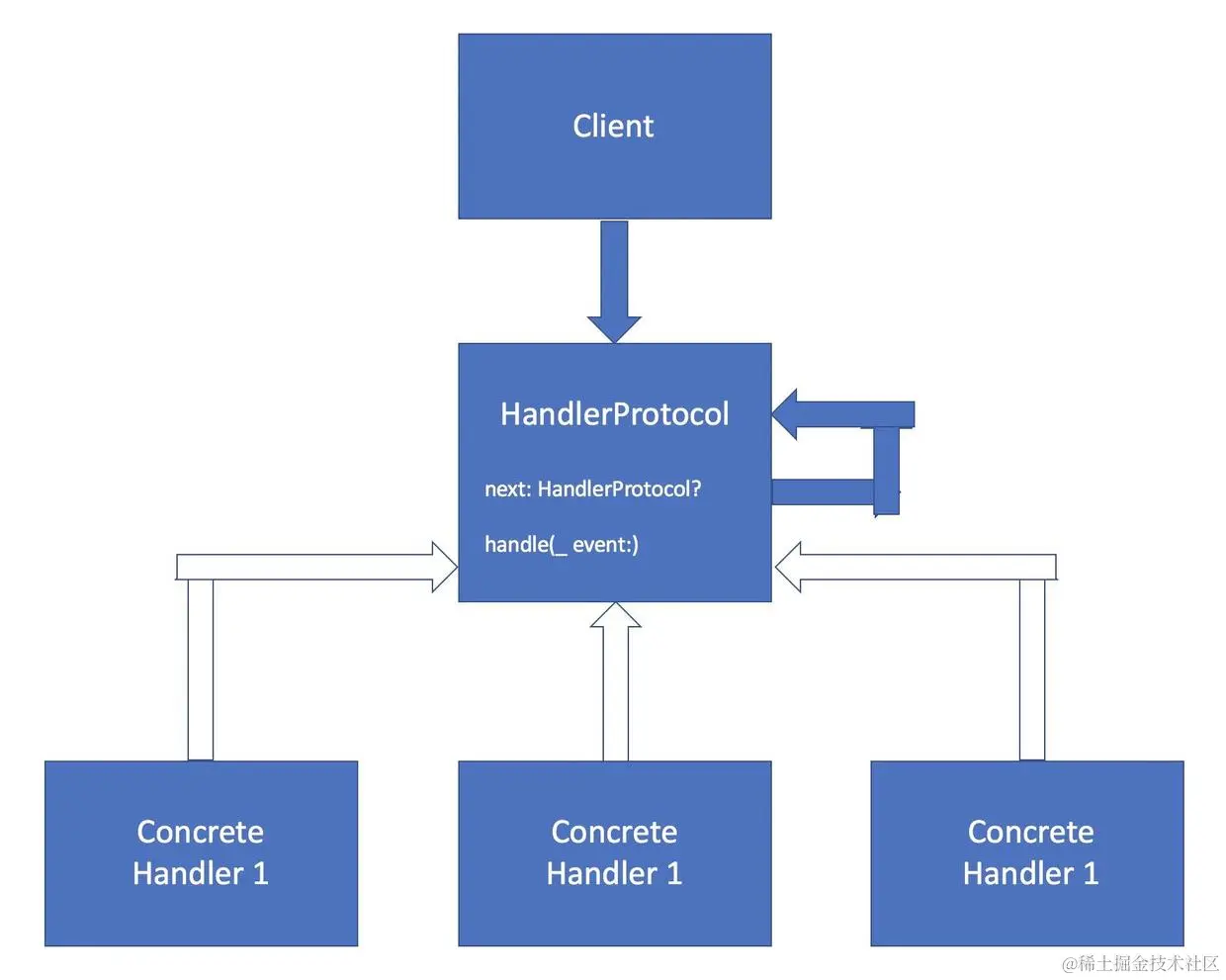 - HandlerProtocol:定义了 Concrete Handler 需要实现的属性和方法。HandlerProtocol 不一定是协议,也可以是一个基类。
