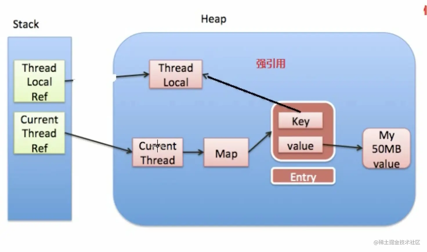但是由于threadRef还在运行,此时entry不会被删除,则导致threadlocal也不会被回收。