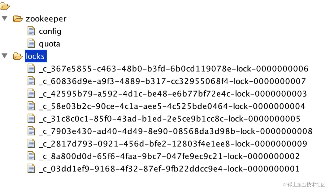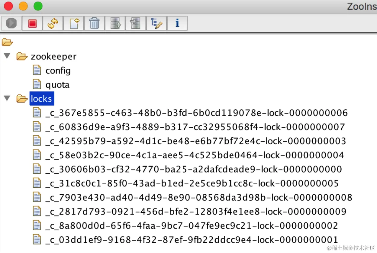 每个线程都尝试在zk上建立了临时有序的节点,然后按照最小的节点编号依次获取锁进行逻辑处理,当释放锁后,会进行通知其他线程可以同时抢占锁了,然后剩下的最小序号的节点会获取锁,依次往下执行... 下面是不断刷新ZooInspector的图示: