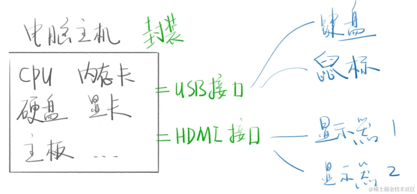 - 这些功能就是接口,如 USB接口 HDMI接口